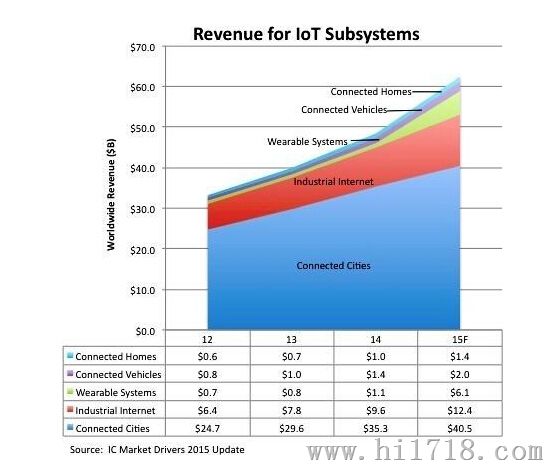 物聯(lián)網(wǎng)是新一代信息技術的重要組成部分,也是信息化時代的重要發(fā)展階段,被稱之為繼計算機、互聯(lián)網(wǎng)之后世界信息產(chǎn)業(yè)發(fā)展的第三次浪潮。IC Insights將物聯(lián)網(wǎng)市場分為連網(wǎng)汽車、連網(wǎng)家庭、工業(yè)因特網(wǎng)、連網(wǎng)城市以及可穿戴設備等五大應用領域,該機構認為其中以可穿戴設備的成長動力最強勁。