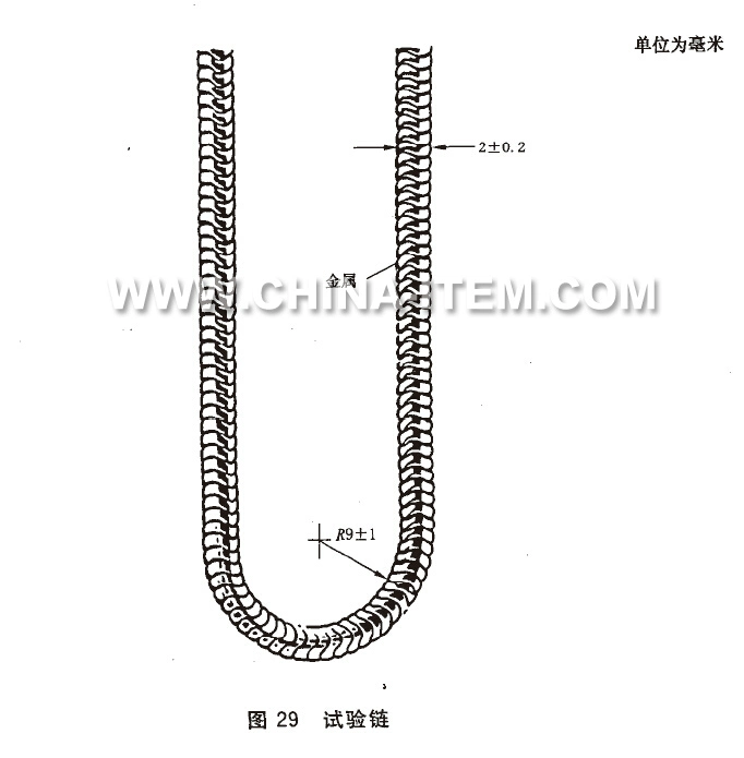 具有符合圖29規(guī)定的鏈環(huán),未涂覆且長度足夠的金屬鏈由63%銅37%鋅制成。當(dāng)以200g/m的負(fù)載拉伸時(shí),該鏈的阻值為2.5Ω/m±20%。...